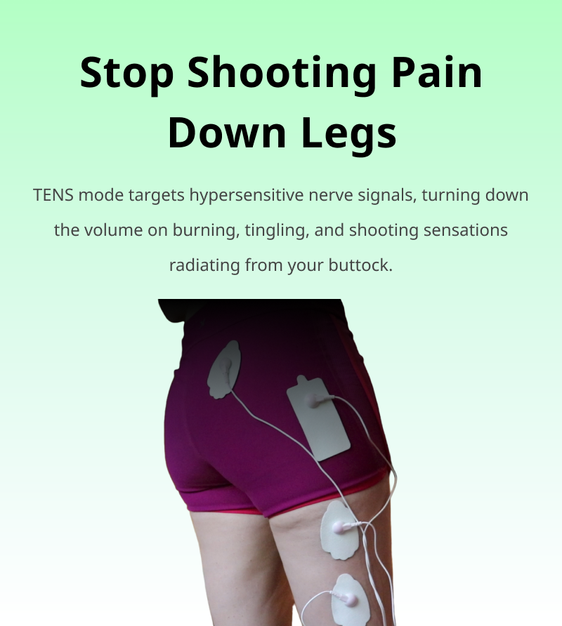 Phase 3 - TENS Nerve Calming: Targeted electrical nerve stimulation "overrides" the pain signals traveling down your leg, while the muscle continues to relax and release pressure.